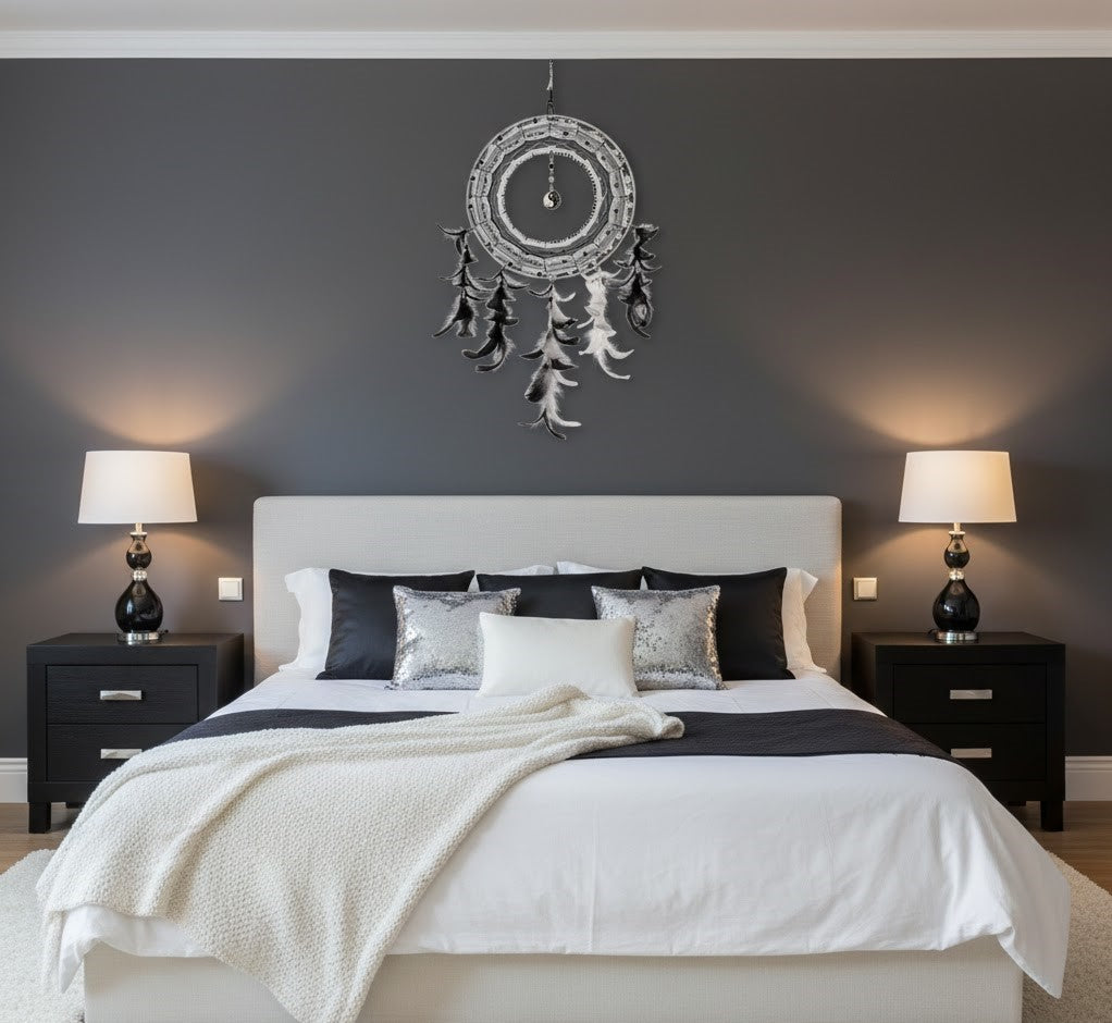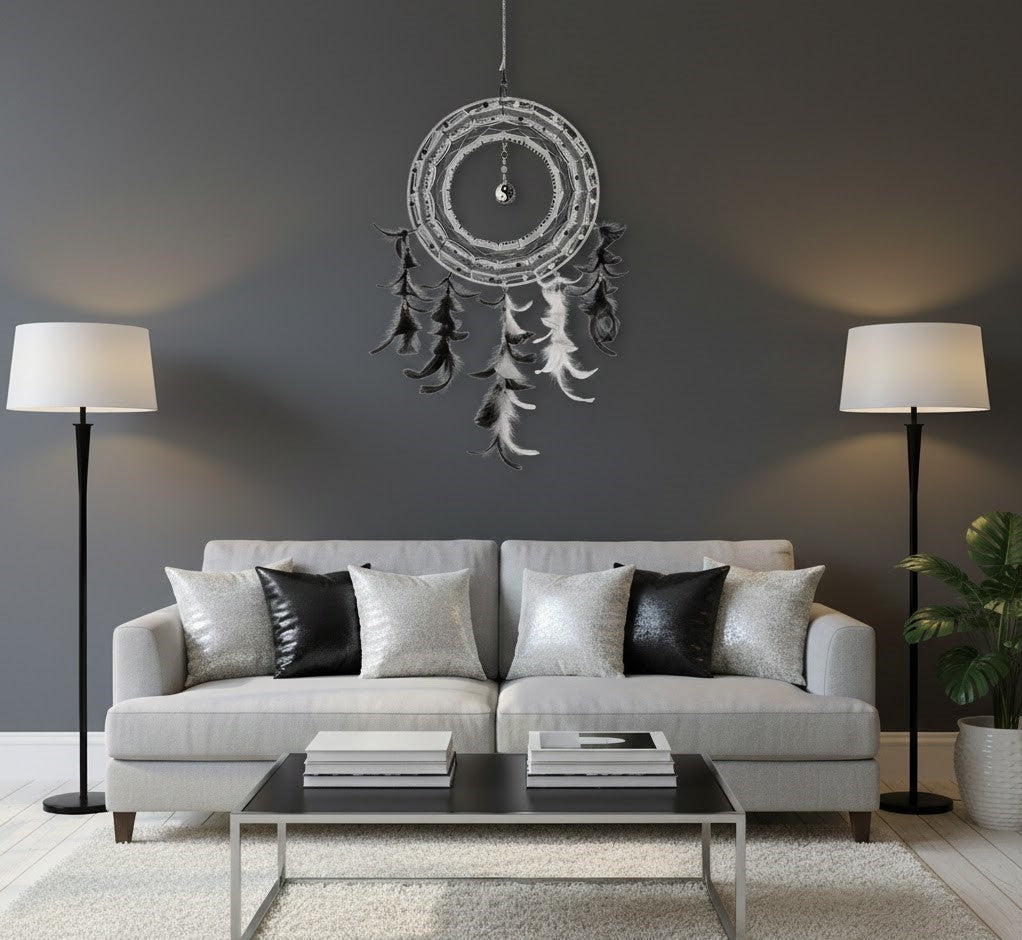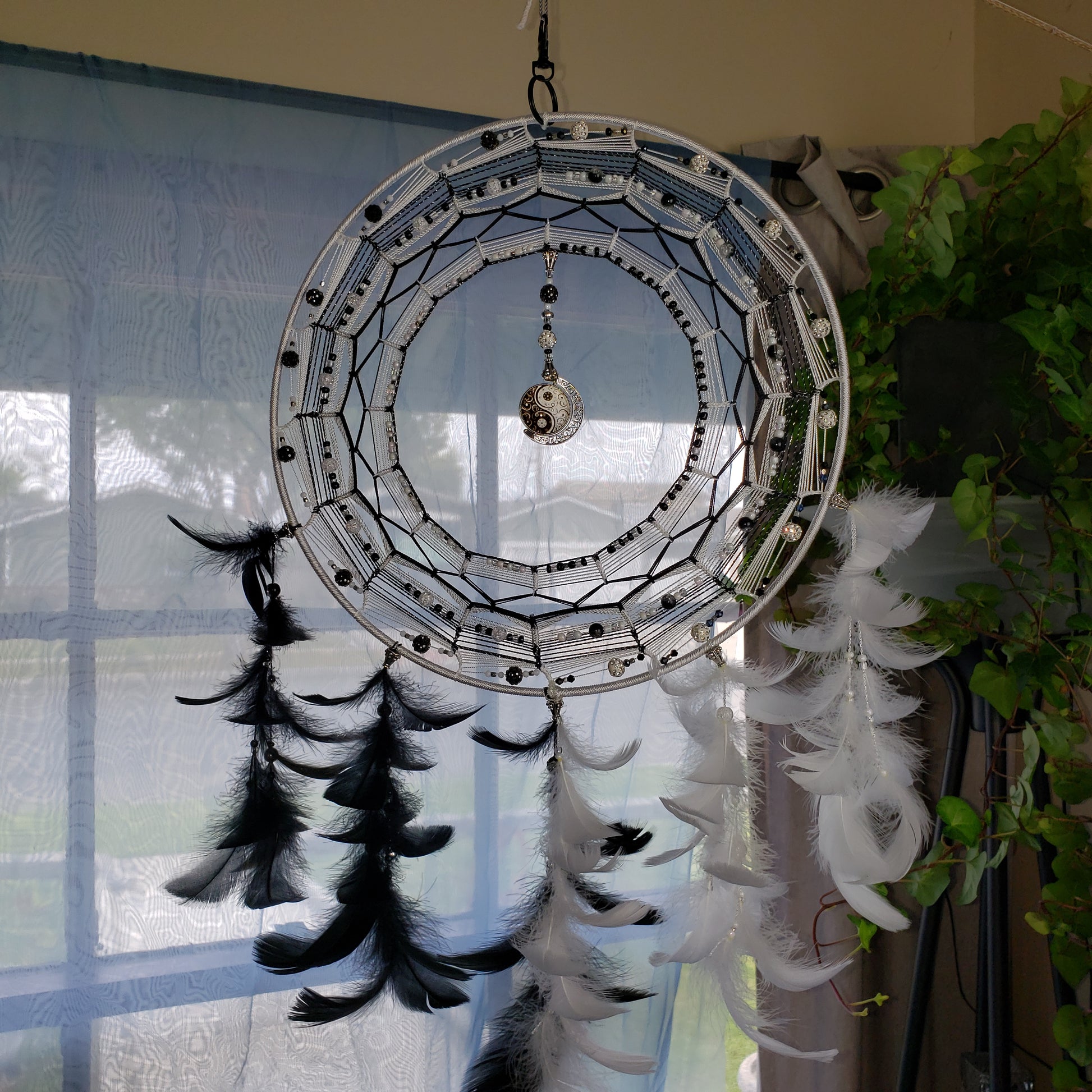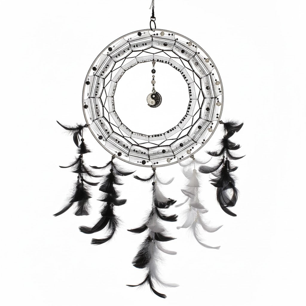 Capture sweet dreams with this striking, hand-crafted dreamcatcher. Featuring a classic, elegant design in a timeless black and white color palette, this piece adds a sophisticated bohemian touch to any room—from a child's nursery to a modern adult space.